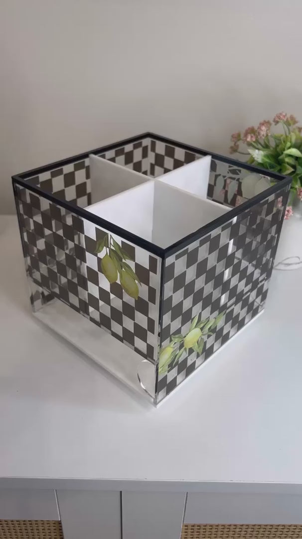 This stunning Onyx Silverware Caddy features Clear & White lucite with trending square black and white design & fresh lemon features. Lends the perfect class to your table! Includes four compartments, plus a napkin holder on the bottom. Swivels for easy access, always.