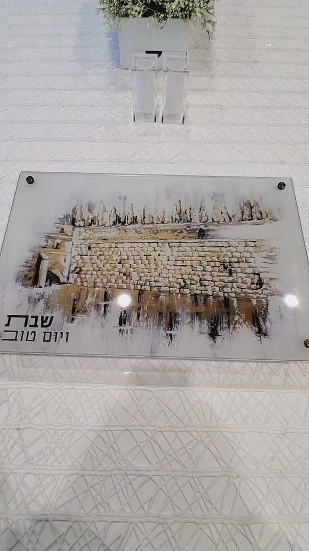 This magnificent, one-of-a-kind Painted Raised Lucite Challah Board features a layer of lucite covered with tempered, heat and scratch resistant glass. Features thick clear lucite and a painted kosel, and 2" metal standoffs, lifting the board off the table. This allows for you to put a place setting under the tray, this tray would make a great gift!