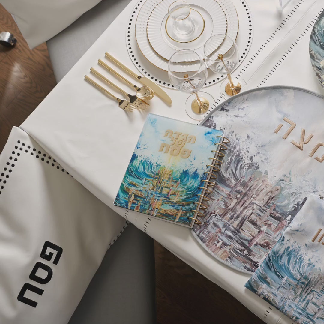 Featuring 12 lucite pages (22 sides) with 9 modern masterpieces of art. The perfect size for easy reading. A gorgeous addition to your Seder table!