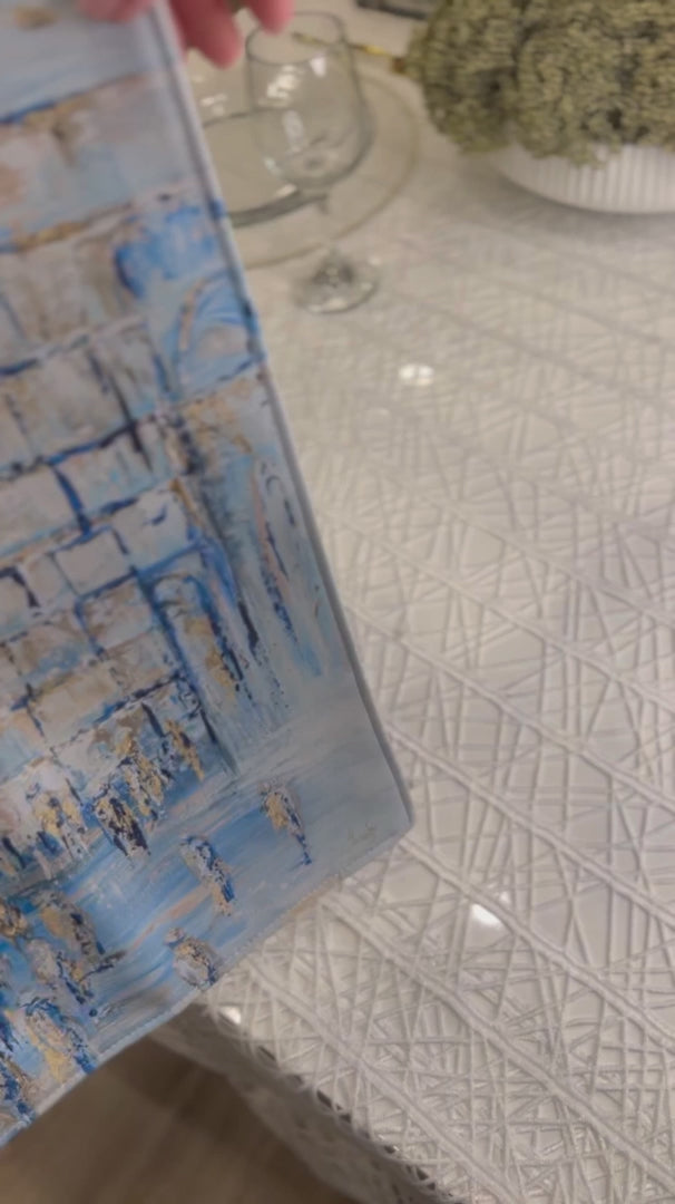 This magnificent, one-of-a-kind Lucite Challah Board features an abstract blue gold Kosel painting, covered with tempered, heat and scratch resistant glass. Light and easy to carry with modern gold metal handles! Lends the perfect class to your table!