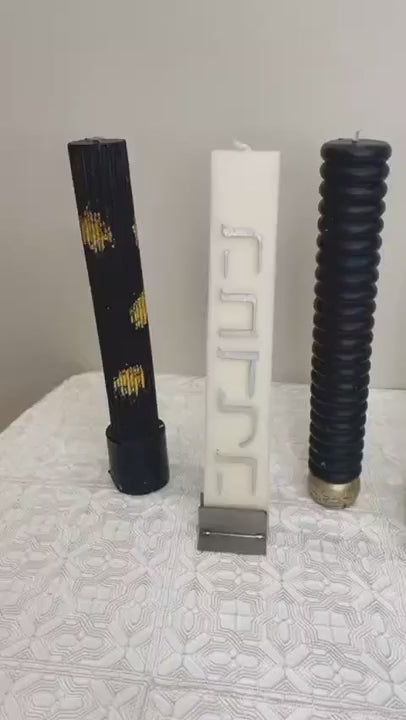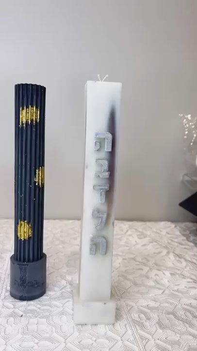 This magnificent luxe Freestanding Ribbed Havdalah Candle will make a striking addition to your Havdalah table. Display and use your Havdalah candle in style! Features embossed words הבדלה on the base. Embellished with metallic gold or silver. Stunning. Smart. Comes in a beautiful gift box ready to gift.
