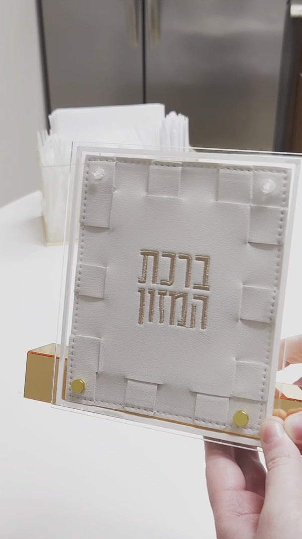 Add modern elegance to your kitchen or table with our luxurious Small Woven Bencher Set. Featuring a woven leather cover with mirrored Hebrew lettering (ברכת המזון), neatly displayed in a clear Lucite holder with chic gold accents, these bencher cards are easy to read, simple to wipe clean, and perfect for everyday use or special occasions.