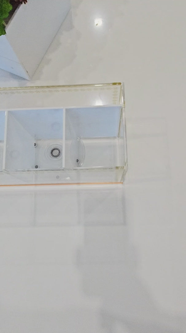 Elevate your kitchen or dining table with this elegant swivel silverware caddy. Made from durable clear acrylic, it features four spacious compartments to organize forks, knives, spoons, napkins, or straws. The 360° rotating base allows easy access from any angle. Finished with a decorative etched border and your choice of silver or gold trim, this utensil holder is perfect for everyday use, Shabbat, or entertaining.