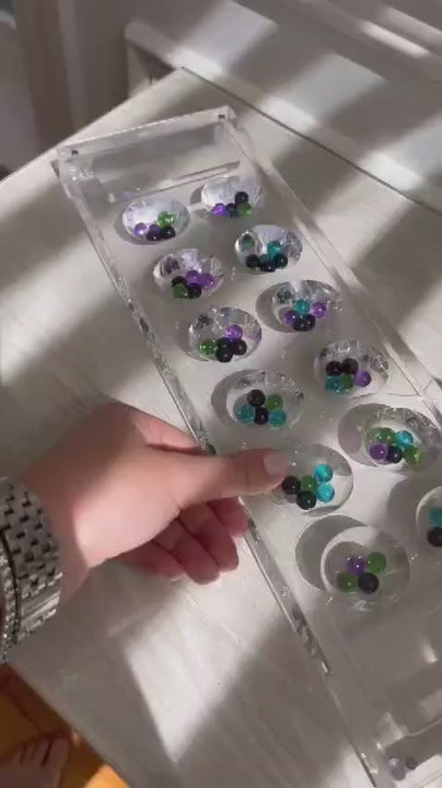 This Modern Lucite Mancala makes playful addition to your living room & family room. Family fun in style! Features clear acrylic board and 48 glass pieces in multiple colors. Includes magnetic lucite cover! The perfect blend of the classic game and modern décor.
