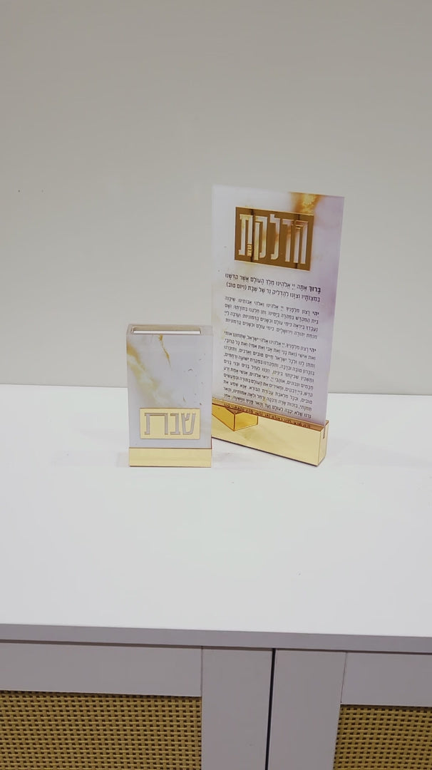 Elevate your candle lighting with this luxurious Hadlokas Neiros marble card (הדלקת נרות), featuring bold “Hadlokas Neiros” lettering across a sleek white and gold marble design. Crafted from premium lucite, the card rests elegantly on a gleaming gold mirror base, creating a striking yet refined look.