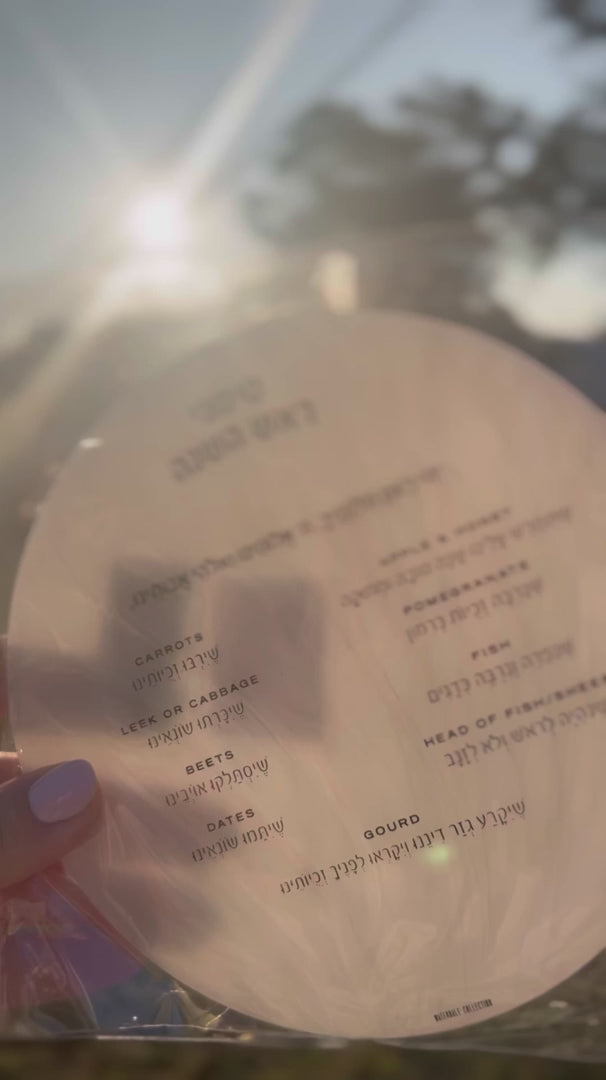 This stunning Marble Round Simanim Card is the perfect and practical addition to your Rosh Hashanah table! Set by each seat or use as a gorgeous centerpiece. Wipe down, honey proof, and water proof.