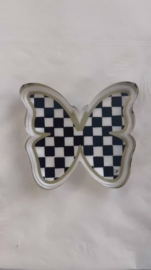 This magnificent, one-of-a-kind Butterfly Onyx Lucite Challah Board features a layer of lucite covered with tempered, heat and scratch resistant glass. Features sophisticated black and white color scheme with gold accent & gold 3d mirrored details, Gold handles and metal standoffs, lifting the board slighting off the table. Both practical and beautiful, this tray would make a great gift!