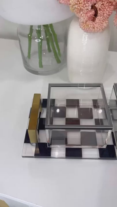 This perfect Onyx Lucite Dip Bowl Set features square lucite dip bowls with covers on black and white onyx base. Simply remove the individual bowls while using, or keep together as one set. Easily hold the tray with the gorgeous gold handles. Coordinate with the other items in our onyx collection - pan holders, caddies, cups and more.